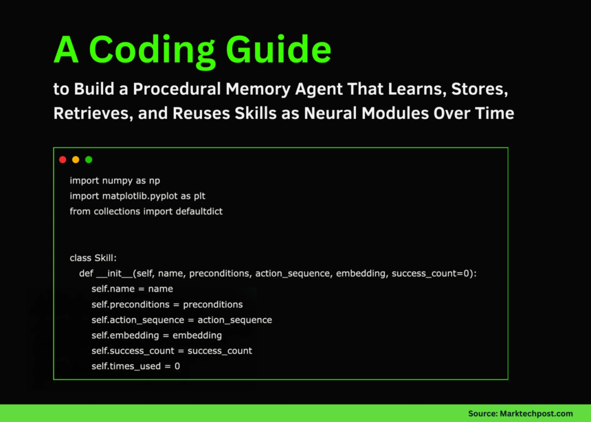 In this tutorial, we explore how an intelligent agent can gradually form procedural memory by learning reusable skills directly from its interactions with an environment. We design a minimal yet powerful framework in which skills behave like neural modules: they store action sequences, carry contextual embeddings, and are retrieved by similarity when a new situation resembles an experience. As we run our agent through multiple episodes, we observe how its behaviour becomes more efficient, moving from primitive exploration to leveraging a library of skills that it has learned on its own. Check out the FULL CODES here.