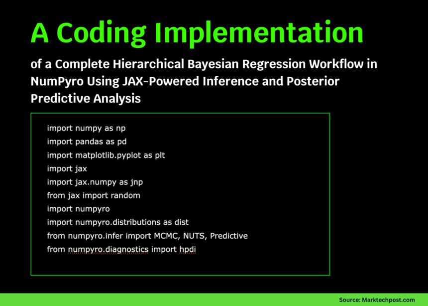 In this tutorial, we explore hierarchical Bayesian regression with NumPyro and walk through the entire workflow in a structured manner. We start by generating synthetic data, then we define a probabilistic model that captures both global patterns and group-level variations. Through each snippet, we set up inference using NUTS, analyze posterior distributions, and perform posterior predictive checks to understand how well our model captures the underlying structure. By approaching the tutorial step by step, we build an intuitive understanding of how NumPyro enables flexible, scalable Bayesian modeling. Check out the Full Codes here.