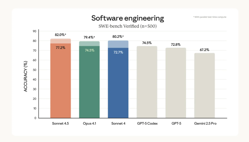 - Computer-use SOTA. On OSWorld-Verified, Sonnet 4.5 leads at 61.4%, up from Sonnet 4’s 42.2%, reflecting stronger tool control and UI manipulation for browser/desktop tasks.