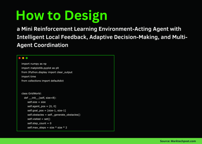 In this tutorial, we code a mini reinforcement learning setup in which a multi-agent system learns to navigate a grid world through interaction, feedback, and layered decision-making. We build everything from scratch and bring together three agent roles: an Action Agent, a Tool Agent, and a Supervisor, so we can observe how simple heuristics, analysis, and oversight combine to produce more intelligent behavior. Also, we observe how the agents collaborate, refine their strategies, and gradually learn to reach the goal while overcoming obstacles and uncertainty. Check out the FULL CODES here.