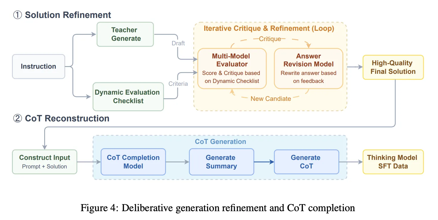 - Post-training focuses on supervision quality, then preference aware distillation. The pipeline uses deliberative solution refinement plus chain-of-thought reconstruction, then Dual Preference Distillation that combines token distribution matching with sequence level preference optimization.