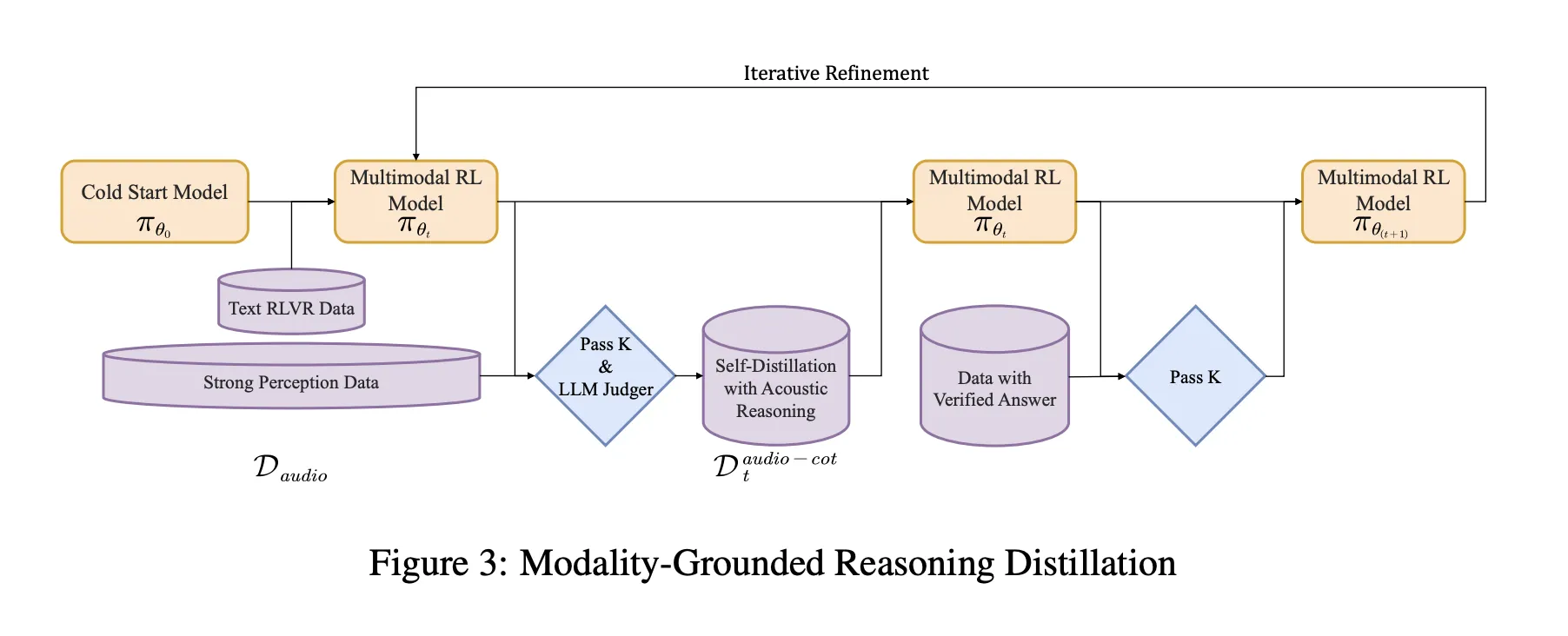 MGRD is applied in several iterations. For each round, the research team samples audio questions where the label depends on real acoustic properties. For example, questions about speaker emotion, background events in sound scenes or musical structure. The current model produces multiple reasoning and answer candidates per question. A filter keeps only chains that meet three constraints: