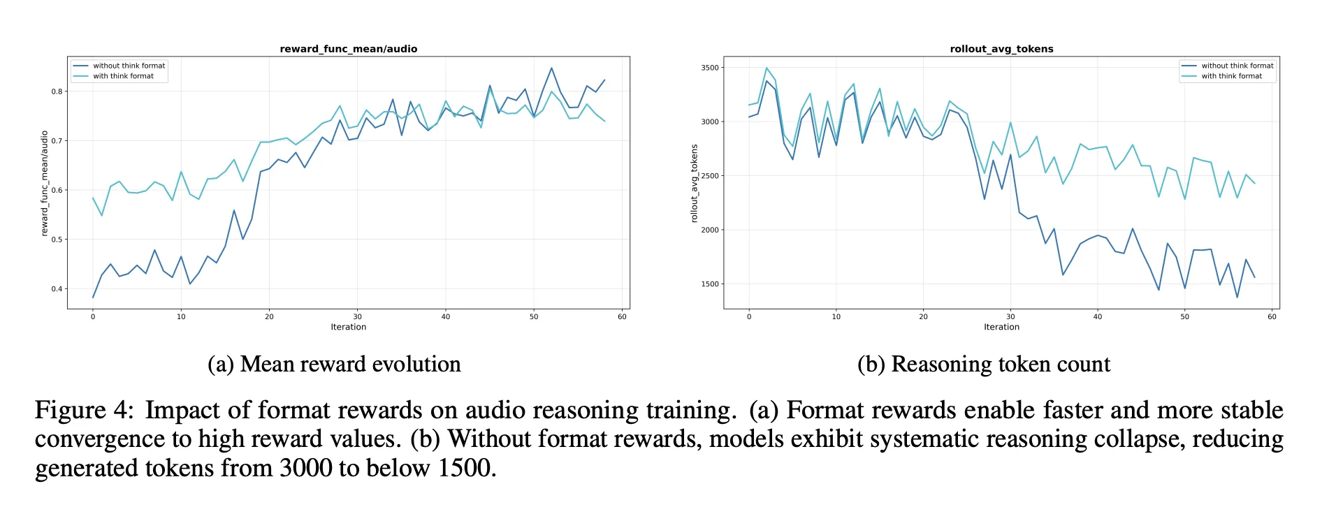 - A reasoning format reward is necessary. Without it, reinforcement learning tends to shorten or remove chain of thought, which lowers audio benchmark scores.