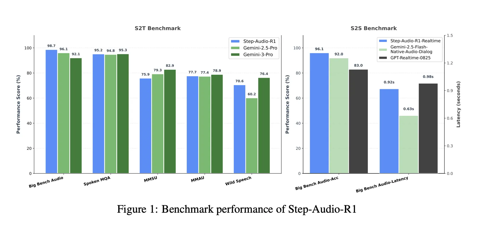 reasoning segments before answers, and is released as a 33B audio text to text model under Apache 2.0. - Across comprehensive audio understanding and reasoning benchmarks covering speech, environmental sounds and music, Step-Audio-R1 surpasses Gemini 2.5 Pro and reaches performance comparable to Gemini 3 Pro, while also supporting a realtime variant for low latency speech to speech interaction.