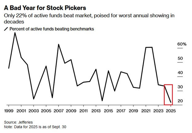 Only 22% of active funds have beaten the market YTD, the worst performance in at least 26 years