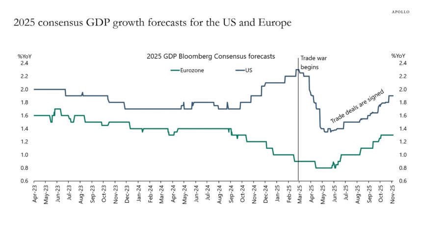 Growth is likely to reaccelerate in 2026, driven by lower trade war uncertainty, a weaker dollar, and a possible GDP boost of ~1 percentage point due to accelerated depreciation