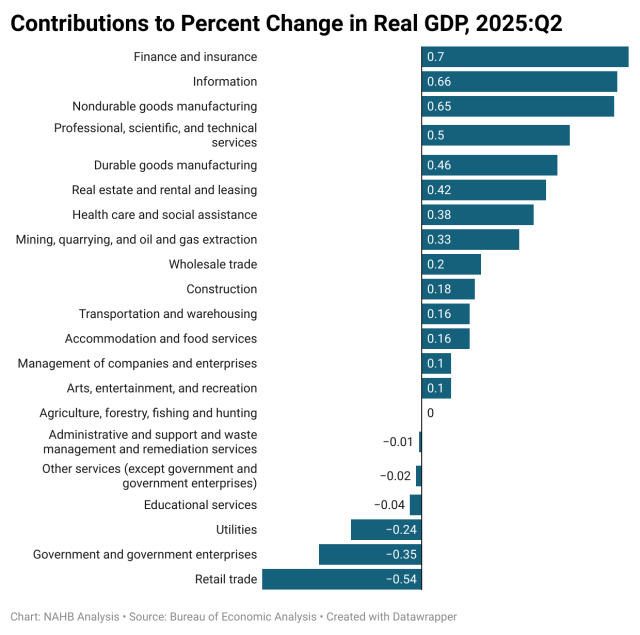 Nationwide, growth in real GDP (measured on a seasonally adjusted annual rate basis) increased 3.8 percent in the second quarter of 2025. The leading contributors to the increase in real GDP across the country were finance and insurance; information; and nondurable-goods manufacturing.