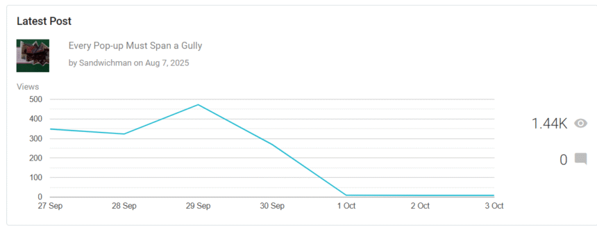 In a little under two months Every Pop-up Must Span a Gully became the all time third most viewed post on Econospeak, racking up nearly 15 thousand views. Meanwhile the only comment on the post was from me, asking why there were no comments on the post if it was so heavily viewed. Then, on October 1 at 9 A.M. (12:00 A.M. Beijing time) viewership screeched to a halt. From highs of over 600 views a day, it receded to views of 8 or 11.