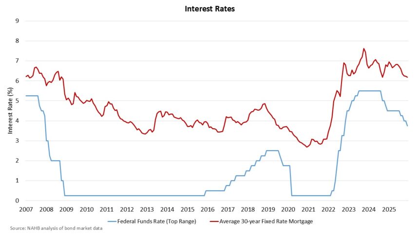 The central bank’s Federal Open Market Committee (FOMC) cut rates a third and final time in 2025, reducing the target range for the federal funds rate by 25 basis points to a 3.5% to 3.75% range. This reduction will help reduce financing costs of builder and developer loans.