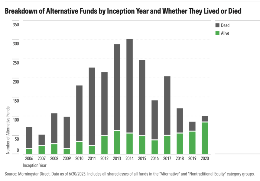 “On Jan. 1, 2015, there were 1,345 alternative mutual funds in existence. Only 341 still existed on June 30, 2025 – a 75% mortality rate.”